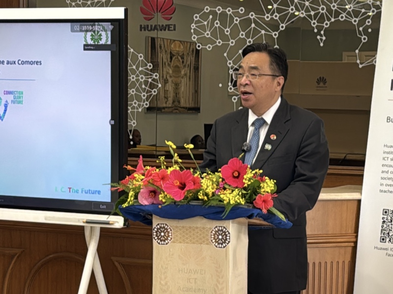 黄大使致辞表示,中国共产党二十届四中全会提出深入推进数字中国建设,释放出中国与世界各国共享机遇、共同发展的强烈信号。中方将继续加强与科摩罗在通信领域的合作,助力科摩罗培养本土通信人才,共同拥抱数字未来,推动中科数字经济合作不断走深走实。